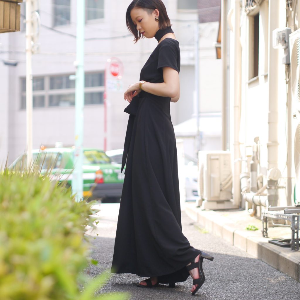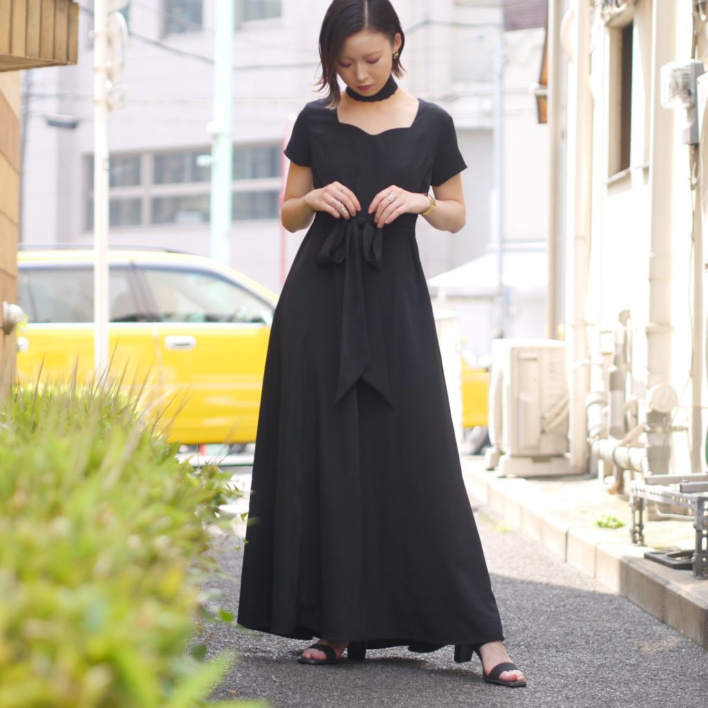 ガッツリと開いた首元にペンシルシルエットでヘルシーな印象に。