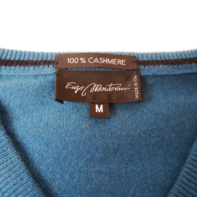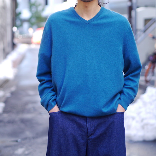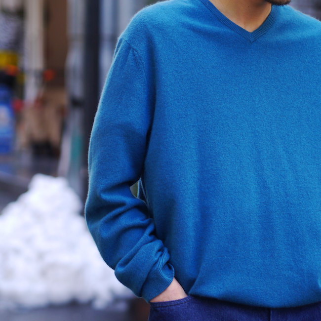 ターコイズブルーが綺麗なカシミヤVネックニット。