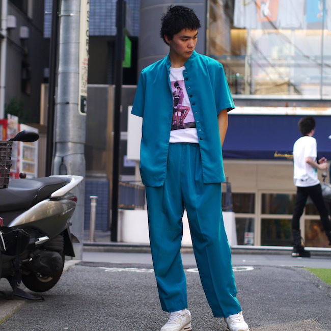 綺麗なブルーグリーンのスタンドカラーセットアップ。